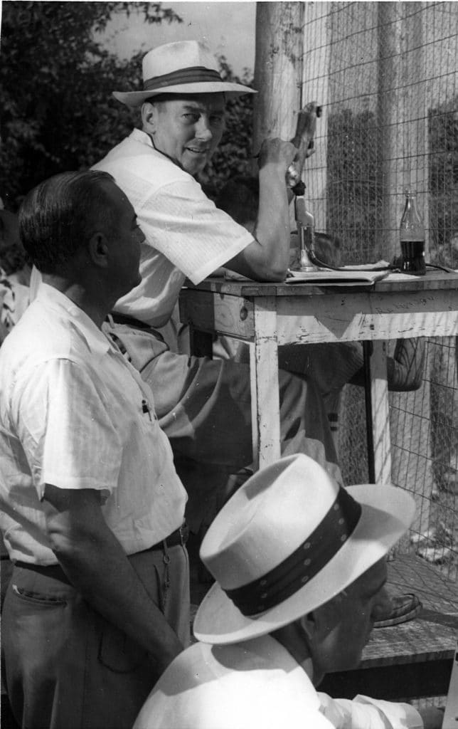 Who is the guy covering his microphone? We’re glad you asked. While searching for photos of Mississippi Sports Hall of Fame media inductees, we found this one of 2005 inductee Bill Goodrich, whose broadcasting career included stints at both Ole Miss and Southern Miss. What many might not know is that Goodrich was a war hero, having participated in the D Day invasion. He was wounded twice in World War II, receiving two Purple Hearts and the Presidential Citation. Goodrich got his start in sports broadcasting doing the high school games of Jackson Central and later first uttered his trademark phrase — “Whew Whew Mercy!” while broadcasting the old Jackson Senators games at the State Fairgrounds, where we believe this photo was taken. Goodrich died in 1999 nearing the age of 85.